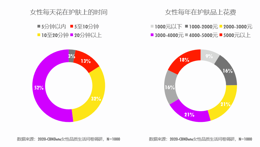 CBNData《報告》指出,近兩年內(nèi),護膚、口服美容等與顏值相關(guān)的品類帶動萬億級的消費增長,其中洗臉儀、按摩儀、蒸臉儀等高科技美容儀備受青睞。55%的女性每年護膚品花費超過3000元,超過半數(shù)的女性每天花在護膚上的時間超過20分鐘。