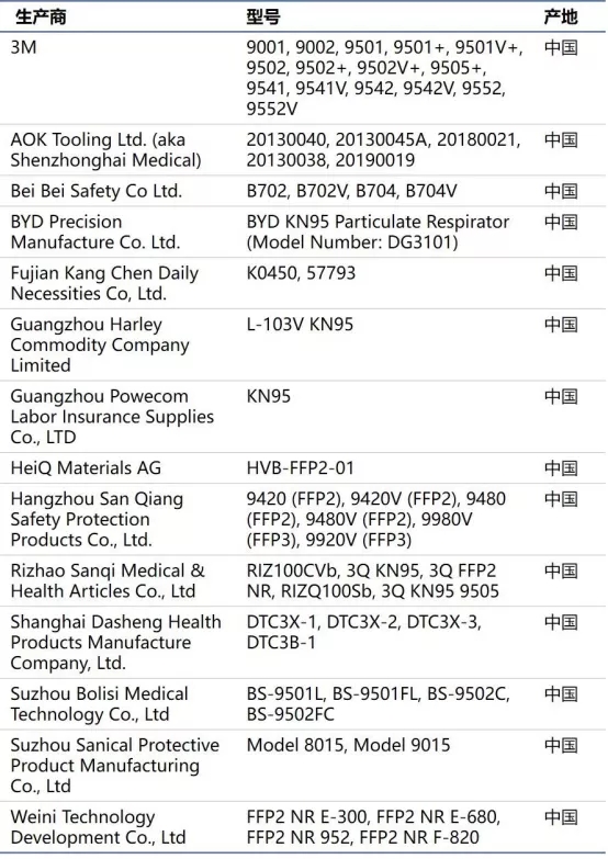 附:FDA 授權(quán)進口的非 NIOSH 批準的中國口罩商名單(5月7日更新)