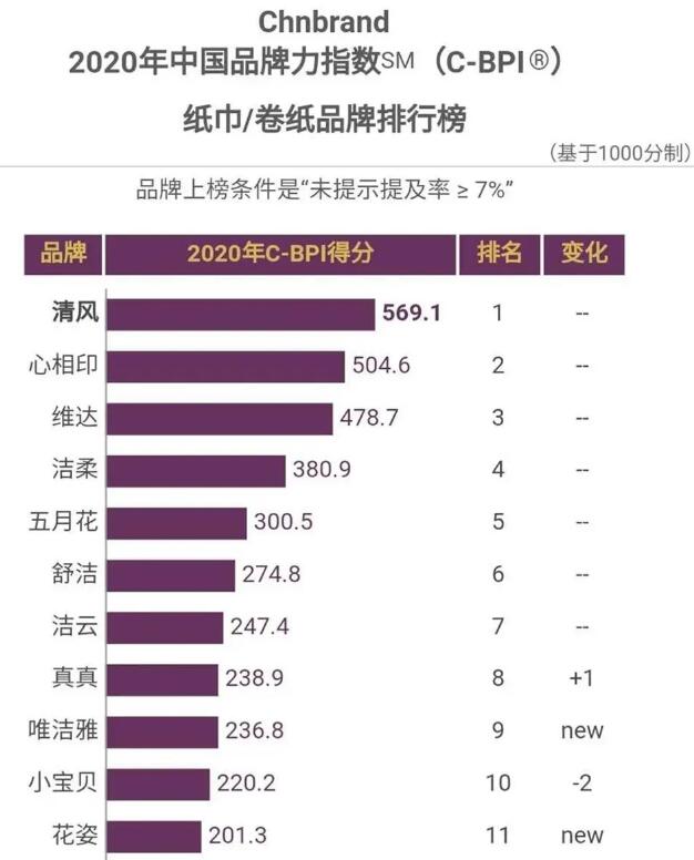 清風(fēng)能夠連續(xù)兩年榮獲“2020年C-BPI中國(guó)品牌榜紙巾/卷紙類第一品牌*”,同公司品牌真真和唯潔雅也成功躋身前十,這不僅證明產(chǎn)品品質(zhì)得到認(rèn)可,更意味著品牌獲得廣大消費(fèi)者的喜愛與支持。