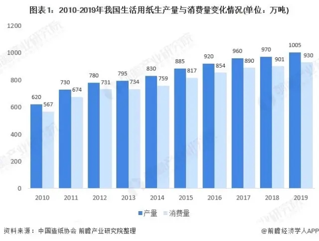 根據(jù)中國(guó)造紙協(xié)會(huì)在歷年《造紙工業(yè)年度報(bào)告》中披露的數(shù)據(jù),2010-2019年我國(guó)生活用紙的生產(chǎn)量與消費(fèi)量整體上呈現(xiàn)逐年增長(zhǎng)的態(tài)勢(shì)。2019年,我國(guó)生活用紙產(chǎn)量為1005萬噸,較2018年增長(zhǎng)3.61%;消費(fèi)量為930萬噸,較2018年增長(zhǎng)3.22%。