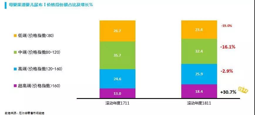 2018年紙尿褲市場(chǎng)最明顯的變化是,多年來固化的內(nèi)外資品牌格局正在被打破,從花王、好奇、幫寶適、尤妮佳、大王為代表的外資大牌紙尿褲發(fā)展態(tài)勢(shì)來看,花王和好奇紙尿褲在大幅下滑,尤妮佳開始超越花王,幫寶適借一級(jí)幫觸底反彈,大王紙尿褲正處上升盛世,不過增長(zhǎng)壓力、控價(jià)壓力越來越大。與此同時(shí),高端紙尿褲市場(chǎng)出現(xiàn)突破機(jī)會(huì)。從尼爾森零售市場(chǎng)數(shù)據(jù)來看,2018年160元以上超高端價(jià)位的紙尿褲銷售額增長(zhǎng)超30%,對(duì)比鮮明的是,中低端紙尿褲市場(chǎng)下滑嚴(yán)重。目前紙尿褲市場(chǎng)中,進(jìn)口有機(jī)材質(zhì)、日夜用等細(xì)分概念,以及適合寶寶運(yùn)動(dòng)的拉拉褲在引領(lǐng)行業(yè)增長(zhǎng),尤其是三四線城市增長(zhǎng)迅速。