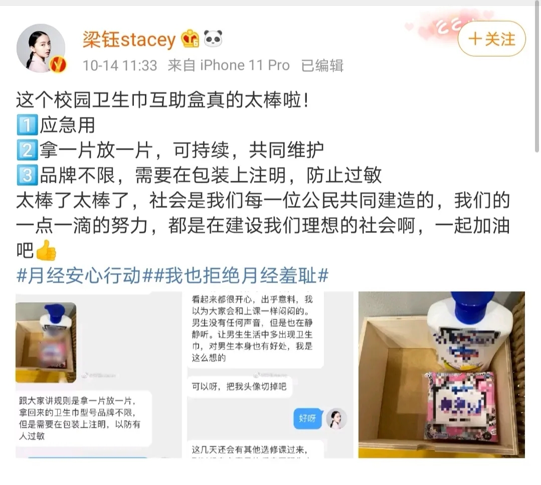 2020年10月14日,博主@梁鈺stacey在微博分享了一位中學女教師給她的留言,該名女教師在教室里做了衛(wèi)生巾互助盒,方便忘帶衛(wèi)生巾的女生使用。