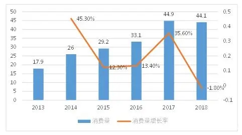 從消費(fèi)量來(lái)看,2013年以來(lái),我國(guó)成人失禁用品的消費(fèi)量增長(zhǎng)較為迅速,從2013年的 17.9億片增加至2018年的44.1億片,年均復(fù)合增長(zhǎng)率達(dá)到19.8%。