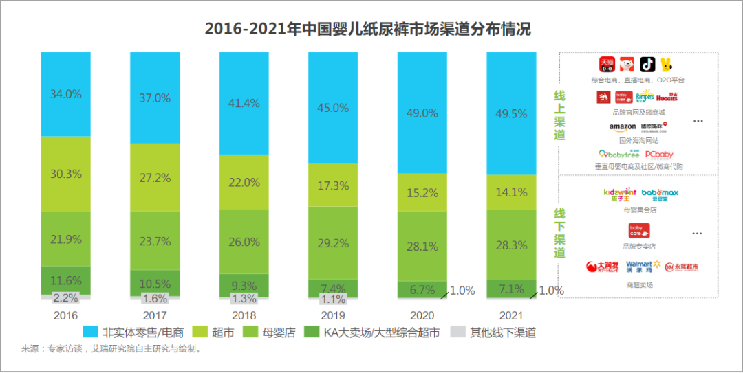 同樣以紙尿褲為例。來自艾瑞咨詢數(shù)據(jù)顯示,2021年嬰兒紙尿褲市場(chǎng)線上渠道占比達(dá)49.5%,超過母嬰店的28.3%和超市的14.1%。