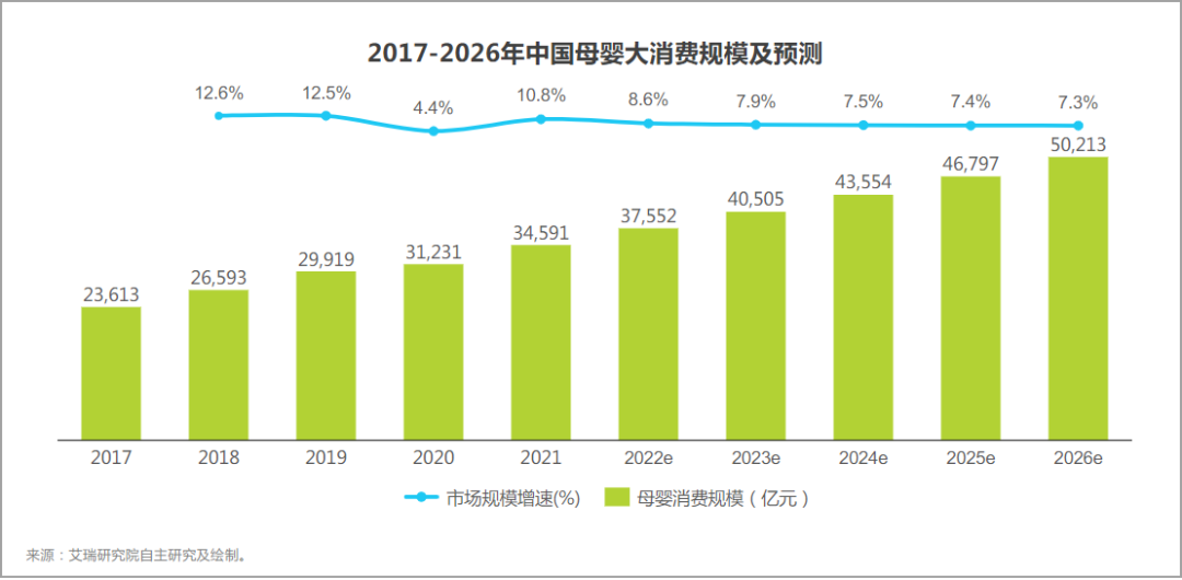 據(jù)艾瑞咨詢數(shù)據(jù)顯示,自2017年中國母嬰消費(fèi)規(guī)模持續(xù)增速基本保持在10%以上,其中再受疫情影響的2020年下滑至4.4%之后已經(jīng)逐漸回暖。