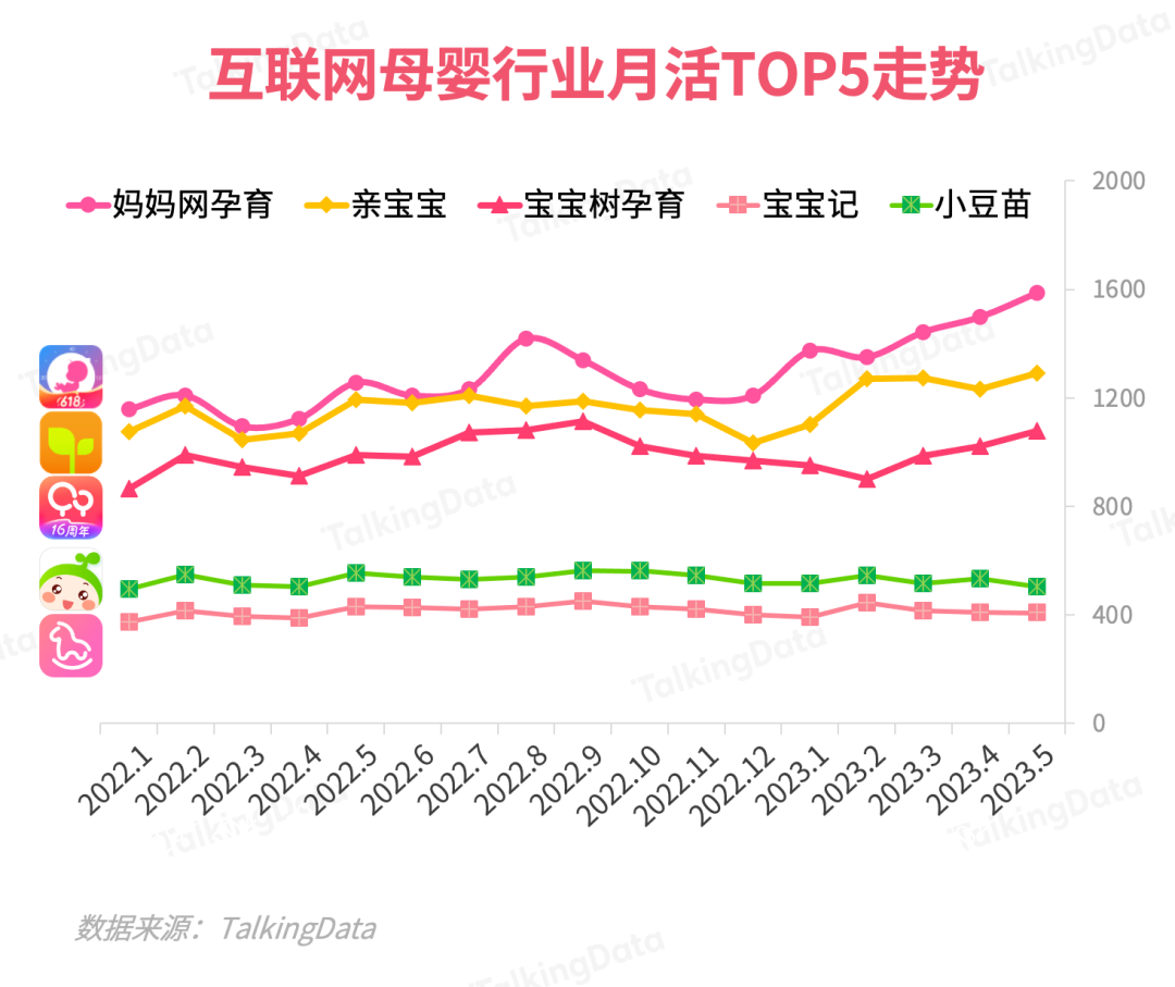 在行業(yè)Top 5平臺的2023年1-5月月活趨勢上,媽媽網(wǎng)孕育、親寶寶、寶寶樹孕育均表現(xiàn)出不同程度的增速??赡艿靡嬗谄淠笅胗脩羧后w的忠誠度和能提供有價值的版塊/內容,媽媽網(wǎng)孕育體現(xiàn)出更為顯著的優(yōu)勢。