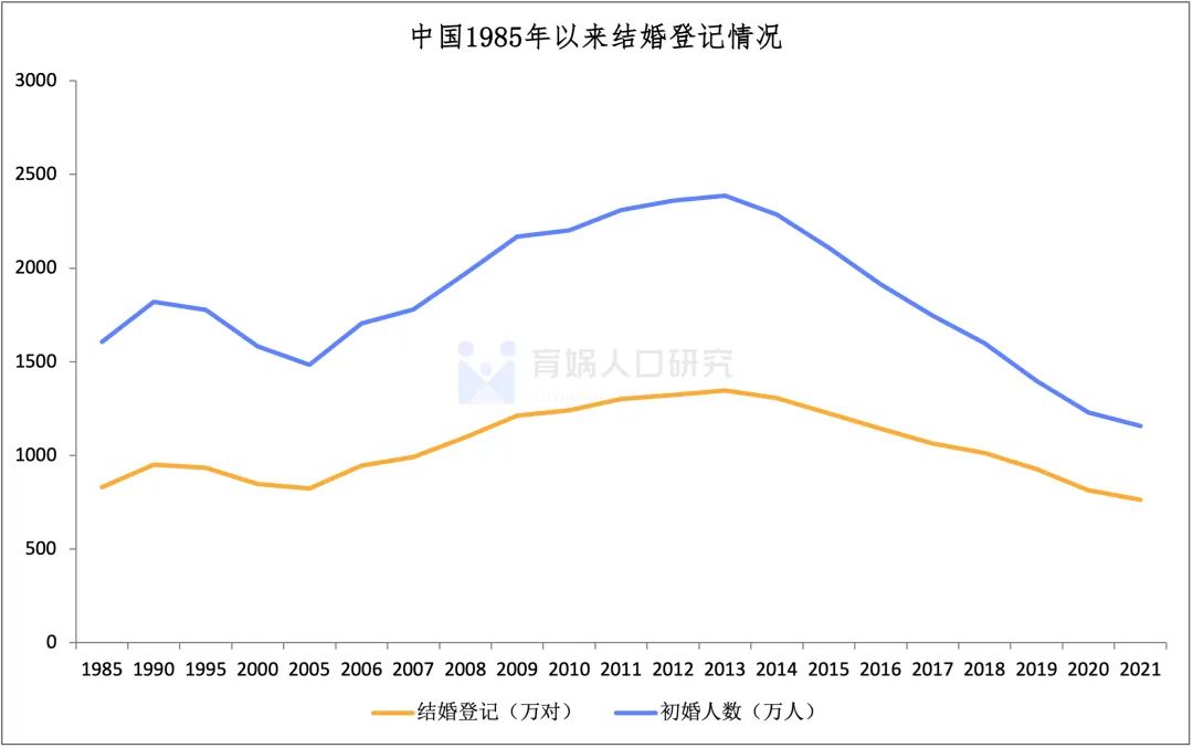 初婚人數(shù)在2013年達(dá)到2386萬人的峰值后持續(xù)下降,2021年下降到1158萬人,比2013年下降51.5%。2013年結(jié)婚登記對數(shù)為1347萬對,2022年結(jié)婚登記對數(shù)下降到683萬對,連續(xù)九年下降。
