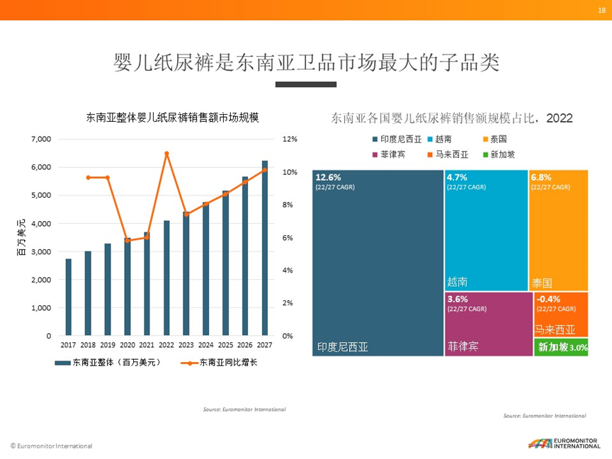 眾多紙尿褲品牌對(duì)東南亞市場(chǎng)情有獨(dú)鐘背后,是可觀的市場(chǎng)前景。根據(jù)Euromonitor(歐睿信息咨詢)數(shù)據(jù)顯示,2022年東南亞一次性衛(wèi)品市場(chǎng)整體零售額達(dá)到了65億美元,其中嬰兒紙尿褲是東南亞衛(wèi)品市場(chǎng)最大的子品類,去年市場(chǎng)規(guī)模超過了40億美元,21-22年同比增長(zhǎng)達(dá)到將近11%。預(yù)計(jì)2027年嬰兒紙尿褲市場(chǎng)會(huì)超過60億美元。